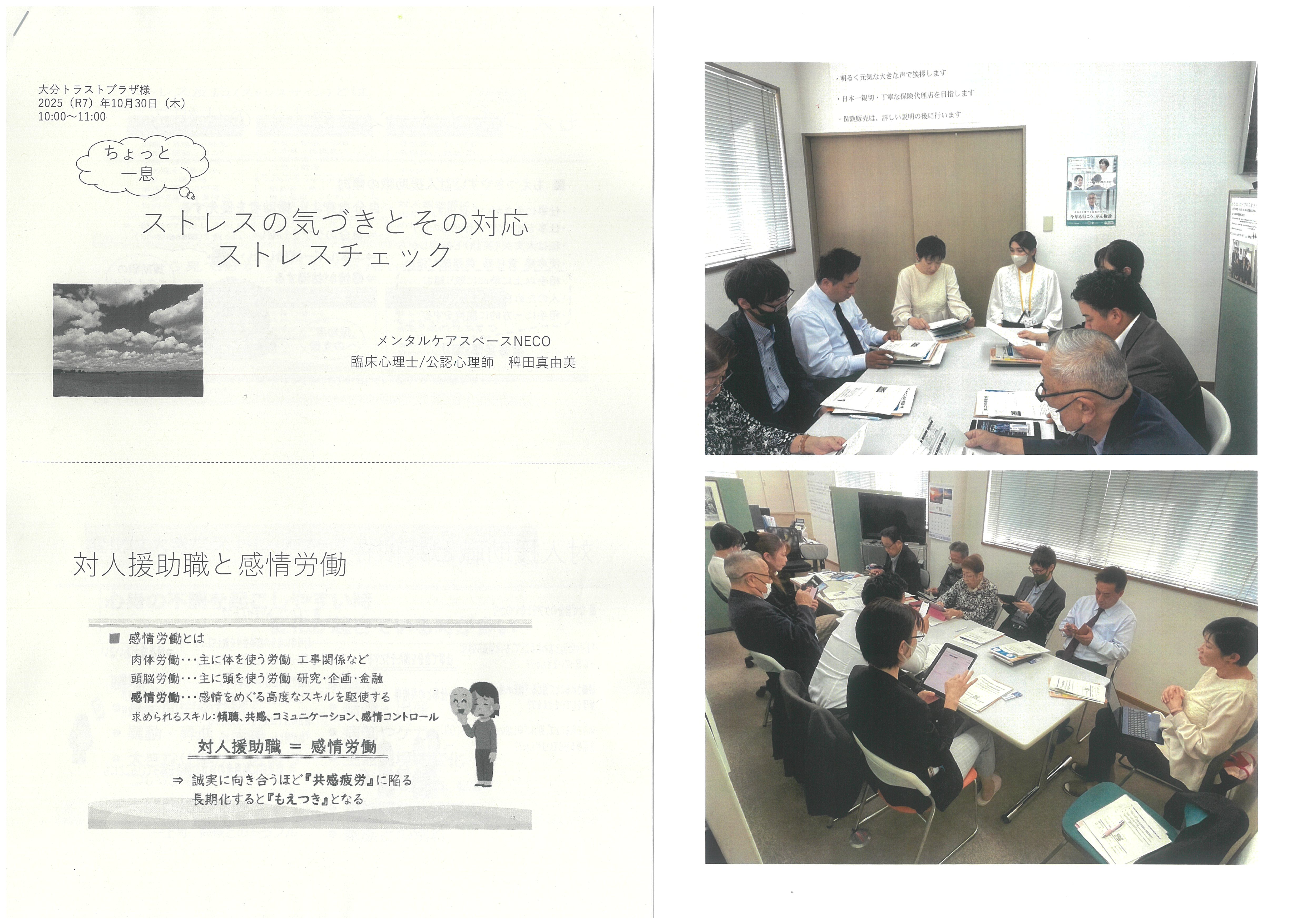 2025年5月の労働安全衛生法改正により、従業員が50人未満の企業に対してもストレスチェックが義務付けられるようになりました。健康推進企業である大分トラストプラザでは別府市健康推進課指導のもと臨床心理士/公認心理師の稗田先生の講話を聞き、その後全員で専用サイトにアクセスしストレスチェックを実施しました。まずは自分のストレスに気づきその対応策を学びました。
